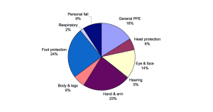 As you can see from this pie chart, 20% or 1 in 5 PPE related injuries are made up of personal injury accidents involving eyes and face.
