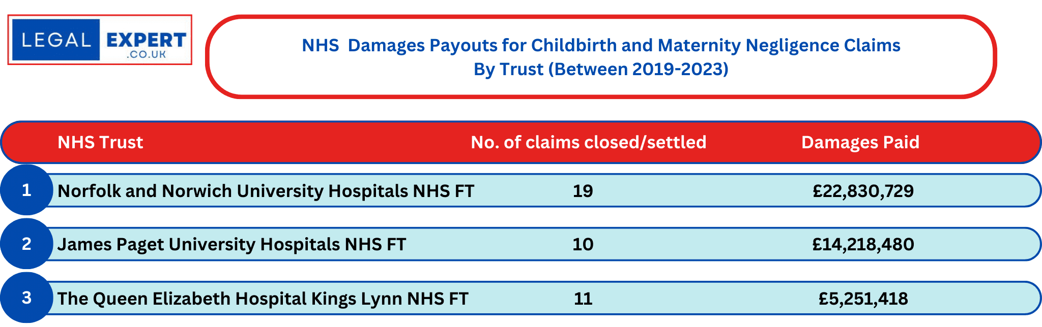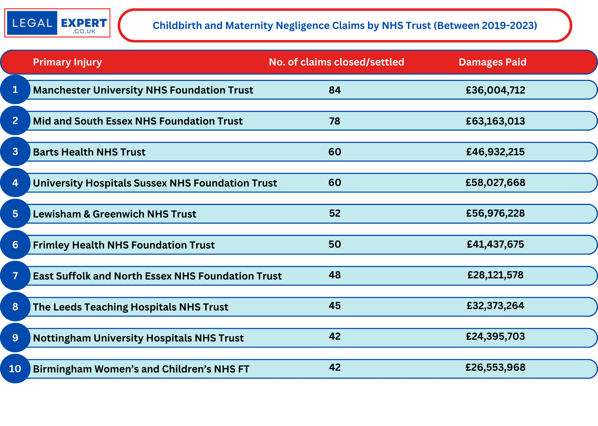 Highest No. of Childbirth and Maternity Clinical Negligence Claims