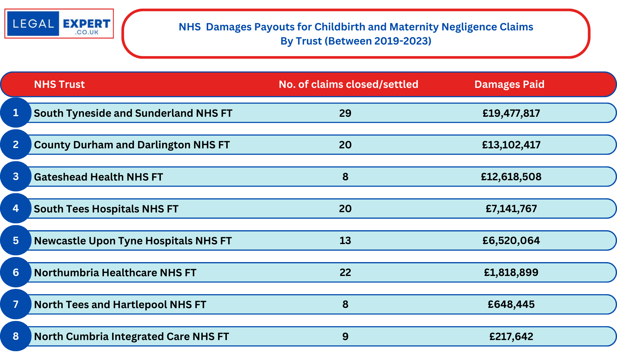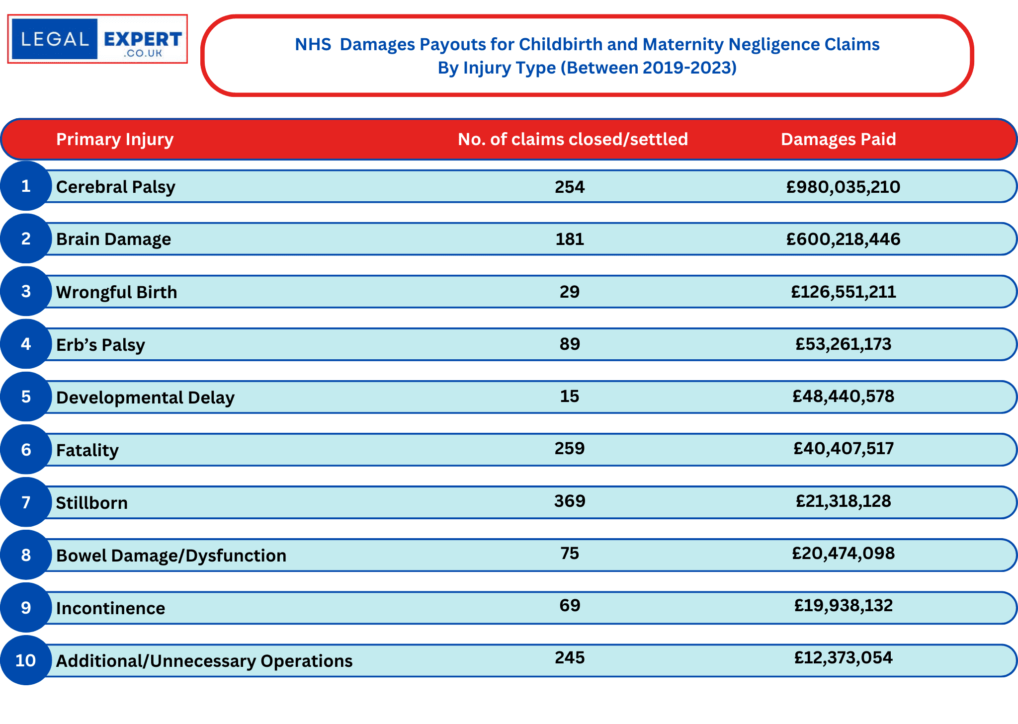Additionally, the Health Service has settled 254 Cerebral Palsy claims with damages amounting to an eye-watering £980,035,20.