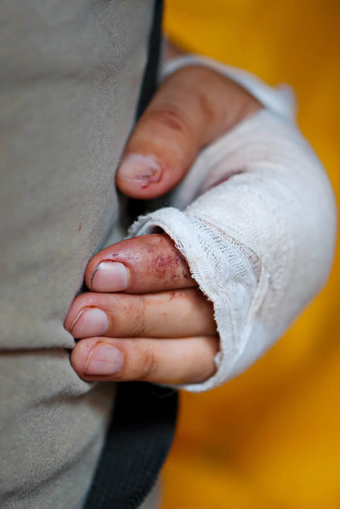 A close-up of a bandaged hand with a bloodied thumb