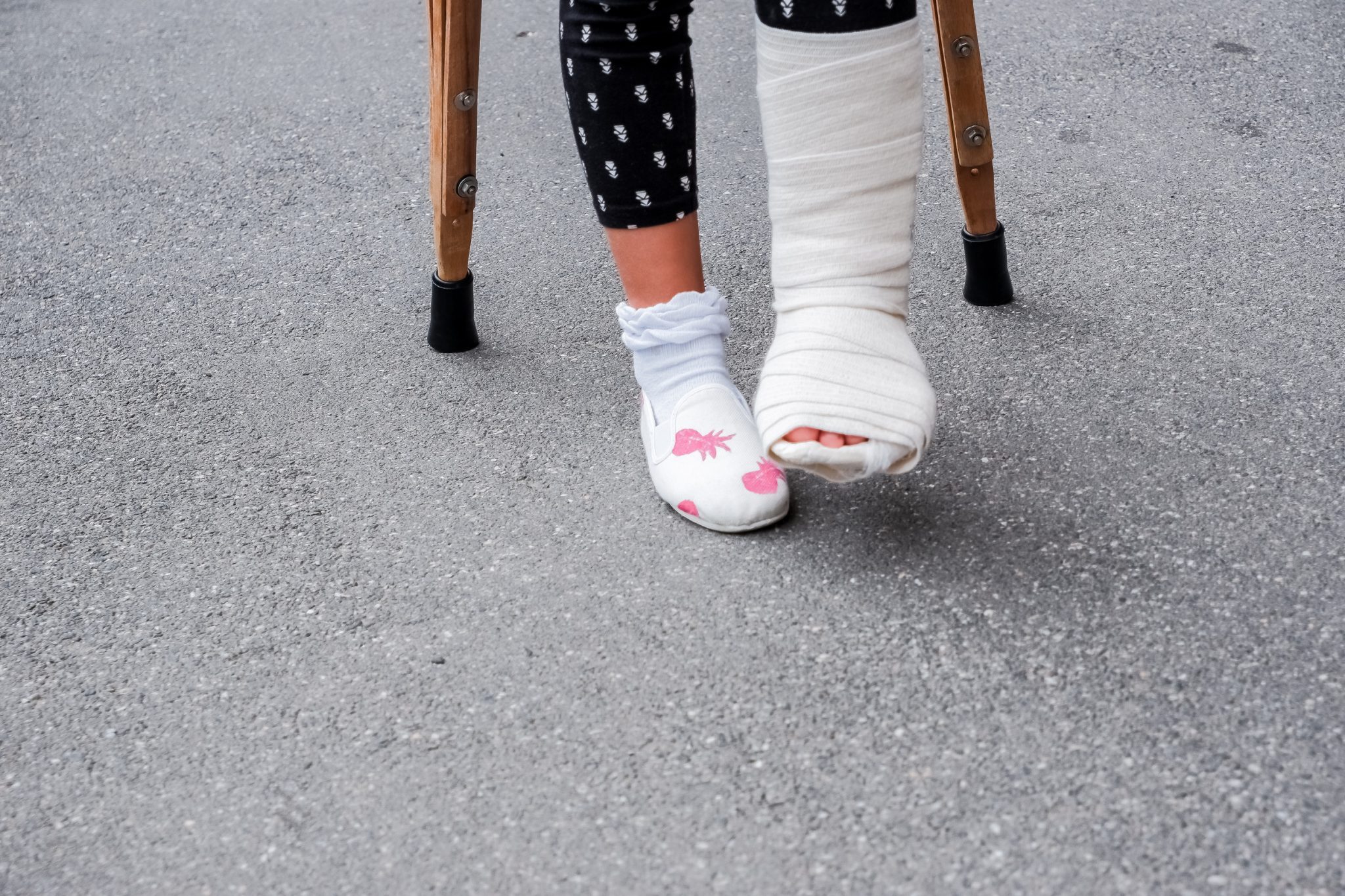 A child uses crutches and wears a cast after suffering a fall accident at a wedding